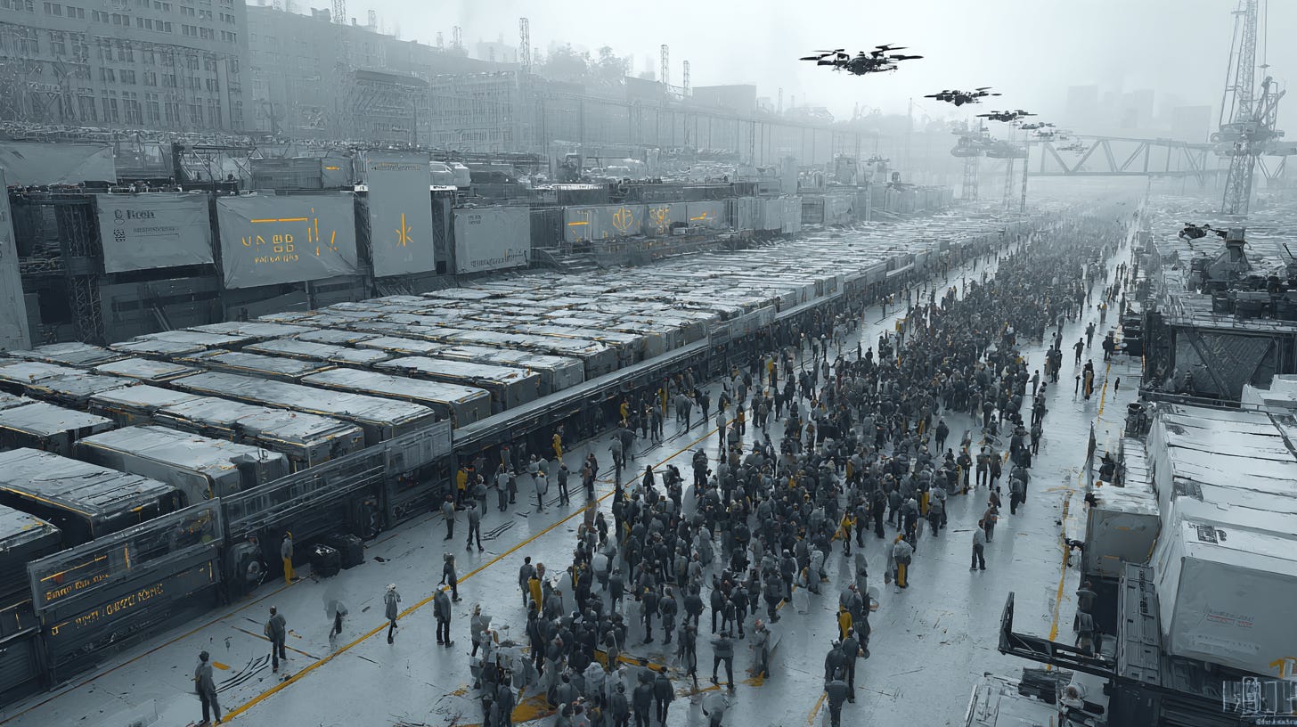 KEVIN RODRIGUEZ: Boston, 2045, Timeline M. Population: 2.1 million, down from 4.9 million in 2025. Those elegant brownstones you remember? They’re processing centers now. Faneuil Hall is where you get your monthly protein allocation—assuming your productivity metrics qualify you. The Common is farmland, but it barely feeds a thousand people. Malthus predicted this exactly—population grows exponentially, food production grows linearly. The math is brutal but undeniable.