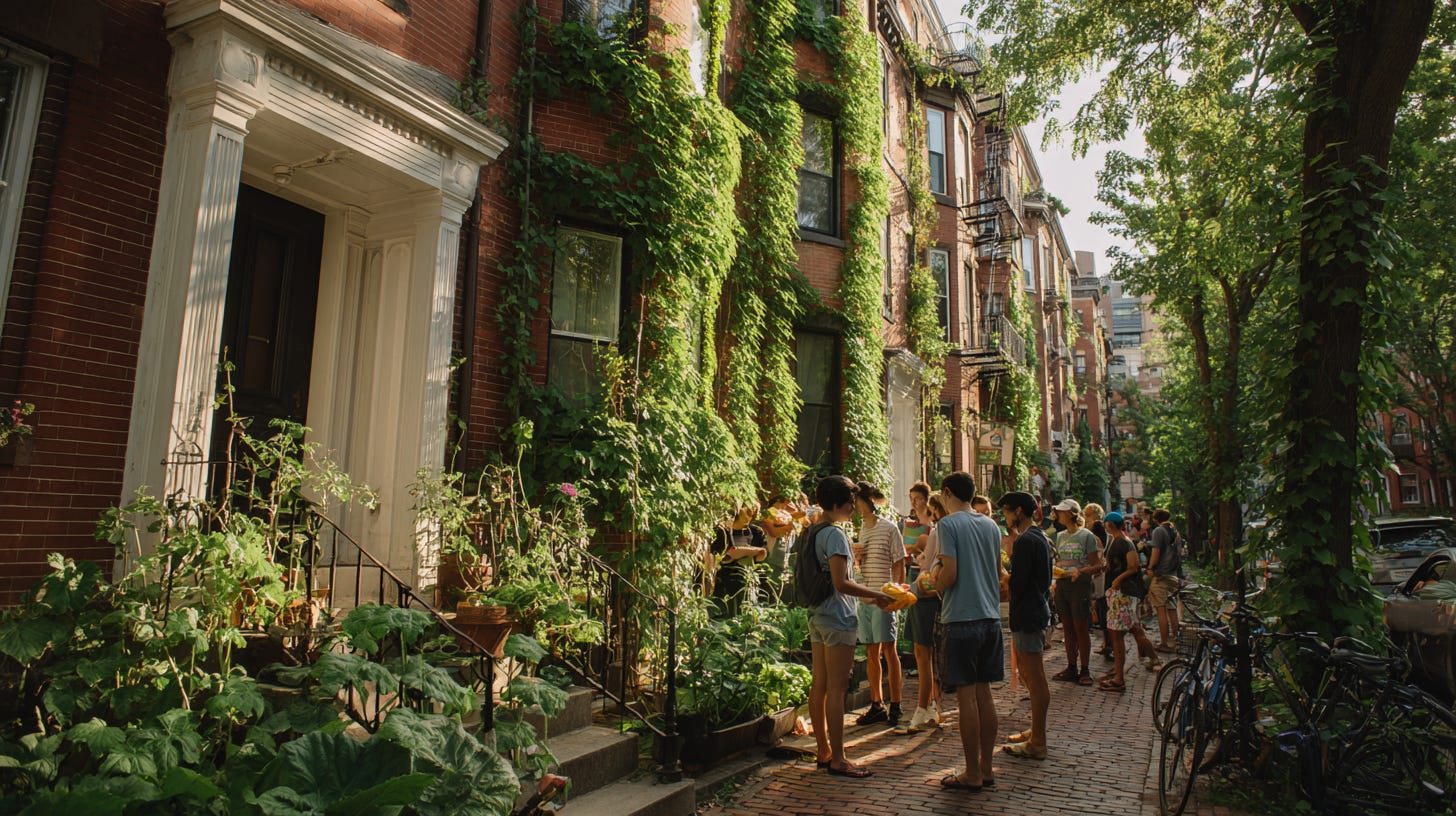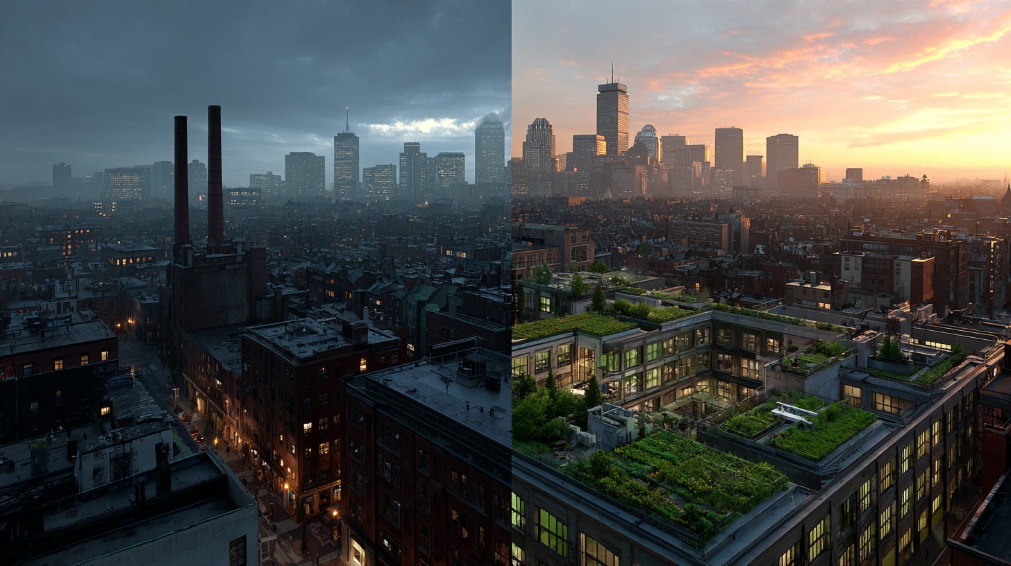 JANE CLARKE: [laughing] Sorry, it’s just—Boston, 2045, Timeline B. Population: 6.2 million and thriving. Those same brownstones have rooftop gardens and vertical farms built into their facades. Faneuil Hall is still a market, but now it’s where neighbors trade homegrown produce and share recipes. The Common? It’s a food forest that feeds ten thousand and hosts free agricultural classes every weekend. We proved Boserup’s theory—more people means more hands, more minds, more solutions.