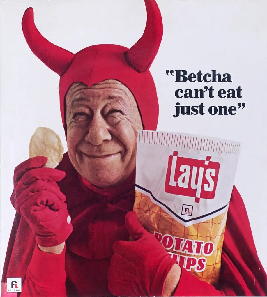 The 1967 Lay’s potato chip commercial, where actor Bert Lahr (who played the Cowardly Lion in the Wizard of Oz) is literally dressed as a devil holding a bag of Lay’s challenging himself, in human Bert form, with the slogan, “betcha can’t eat just one,” is a direct showcase of big food trying to get you to indulge without abandon. And while the marketing has become less overt over the years, the main call-to-action to keep snacking and drinking has not.