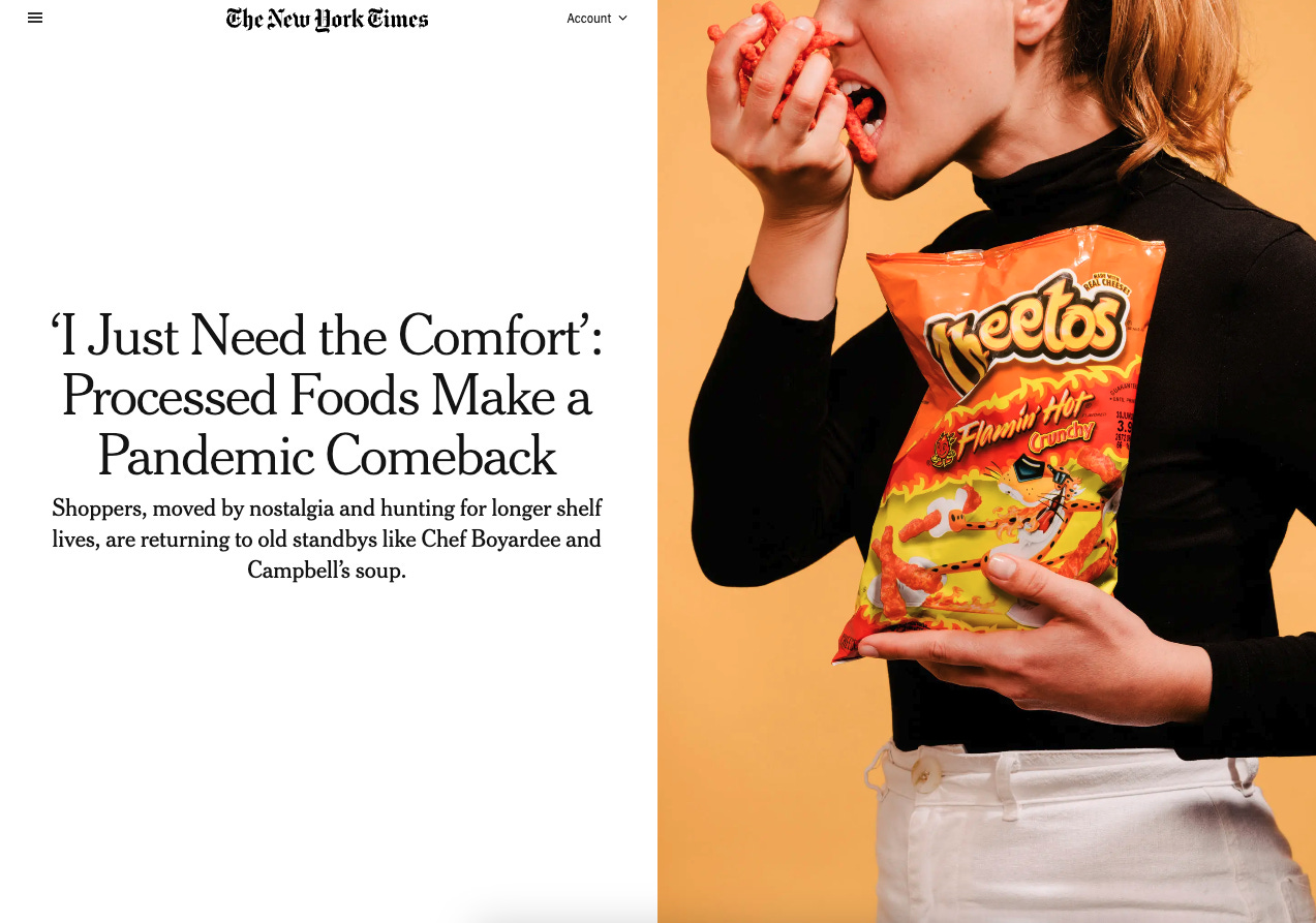 In early 2020 as the fear set in from the pandemic, brands like Campbell's reported soup sales soaring 59% year-over-year, Prego pasta sauce increasing 52%, and Pepperidge Farm Goldfish crackers climbing nearly 23%. The renewed interest in junk food, fleeting as it may have been, was a reminder that emotions ultimately have the power to dominate our food choices especially in times of stress. Suddenly the big brands that were meant to be left behind by BFY brands showed signs of life.