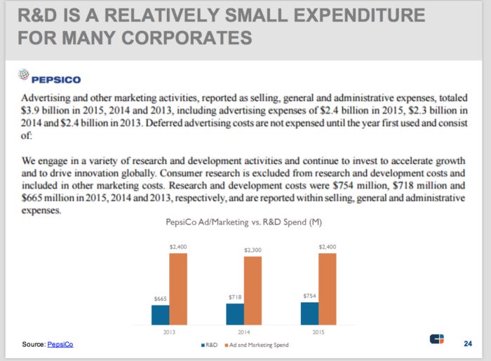 Are the monopoly powers in big food in marketing mode? Absolutely. At PepsiCo, from 2013 to 2015, the company spent 3.1 to 3.6 times more on advertising and other marketing activities than they did on R&D.