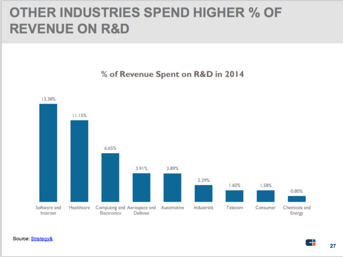 Compared to other industries, the CPG industry as a whole spends 1.58 percent of revenue on R&D compared to 13.38 percent in tech and 11.15 percent in healthcare. Food is just not investing in its own future via product innovation.