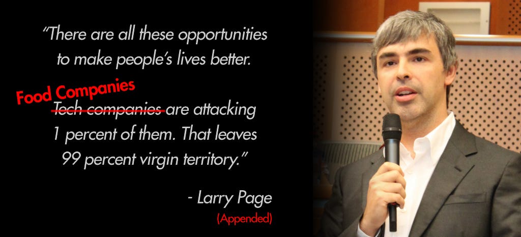 The above Problems (and many more) represent the “99 percent virgin territory” that Larry Page talks about in tech, except for food. Now contrast the magnitude of the above Problems with some of these problems:
