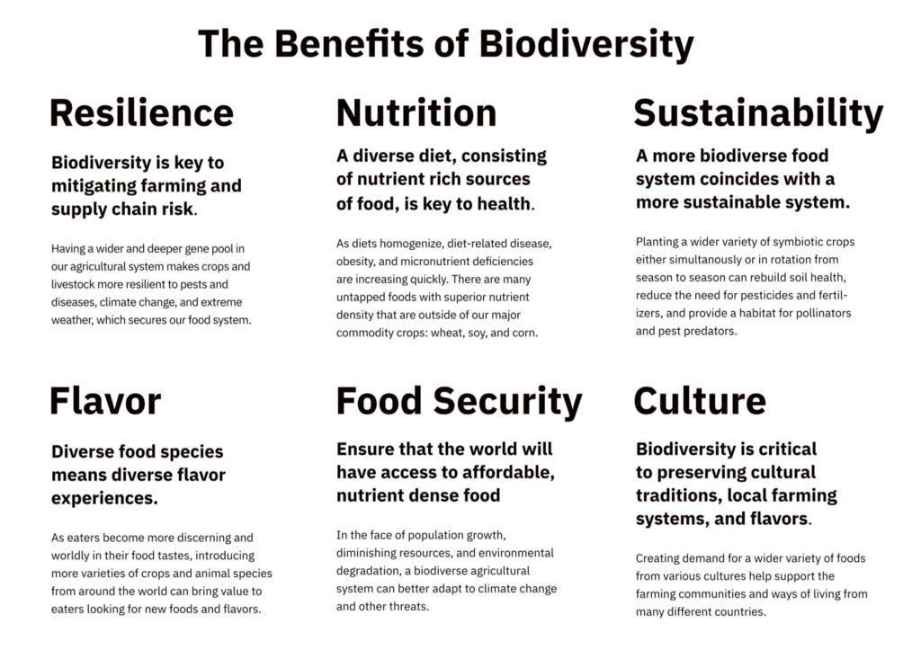 Biodiversity is crucial to the health and safety of our food supply. But to us, biodiversity in food means something even more. Biodiversity sits at the intersection of taste and sustainability, where we can simultaneously satiate an eater’s desire for new, interesting foods, while supporting a more diverse cornucopia of foods being cultivated in the world.