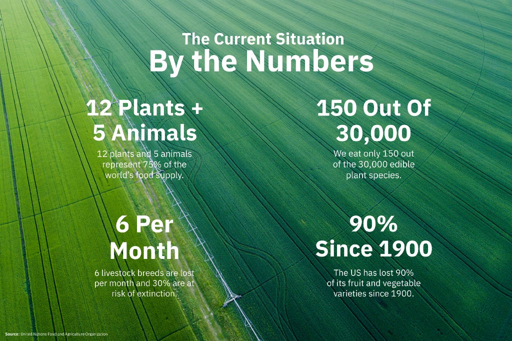 Globally, 75% of our food comes from just 12 plants and 5 animal species. This enormous level of consolidation around just a handful of food sources not only magnifies the impact of any attack on the food supply — like the Irish Potato Famine — but it also consolidates our taste buds around just a few flavor experiences.