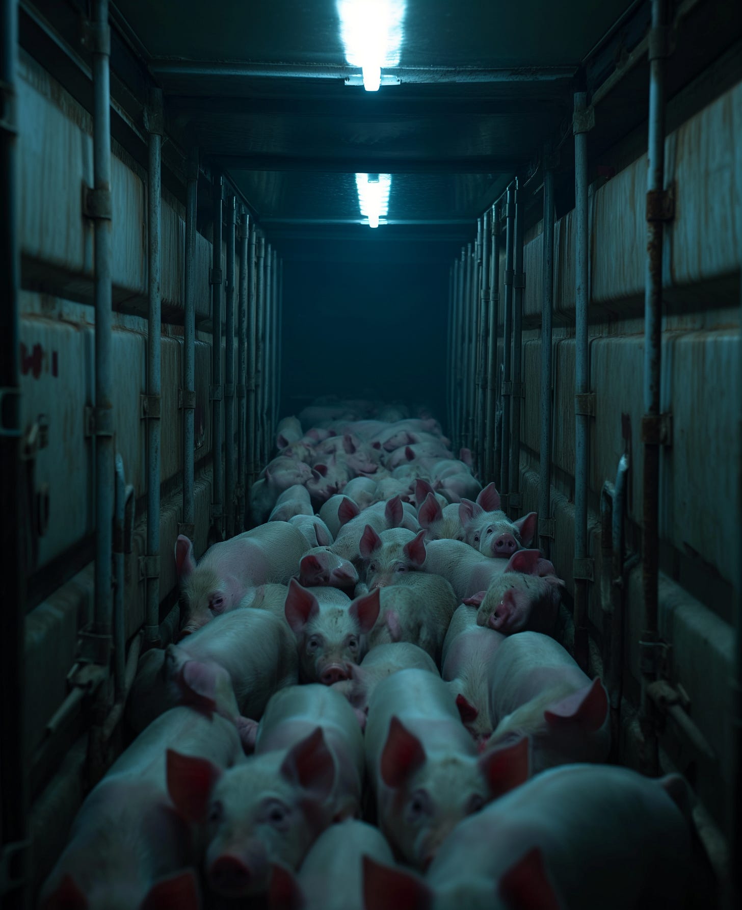 My instructions are to receive a new population of piglets. They have been shipped here from our sister farm six hours away by train. I am to feed and care for them until slaughter. I press the button to open the pale green freight elevator door at the southeast corner, and my robotic wranglers lead the first batch of piglets into the pens.