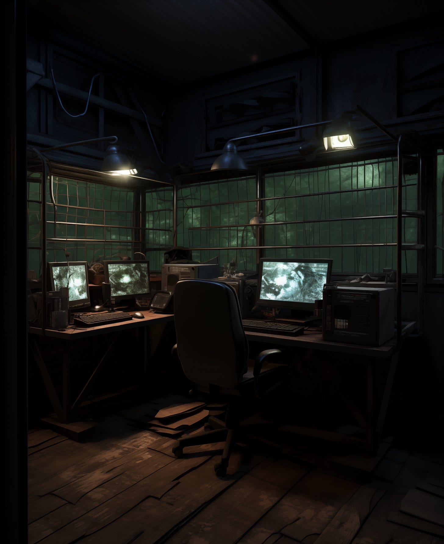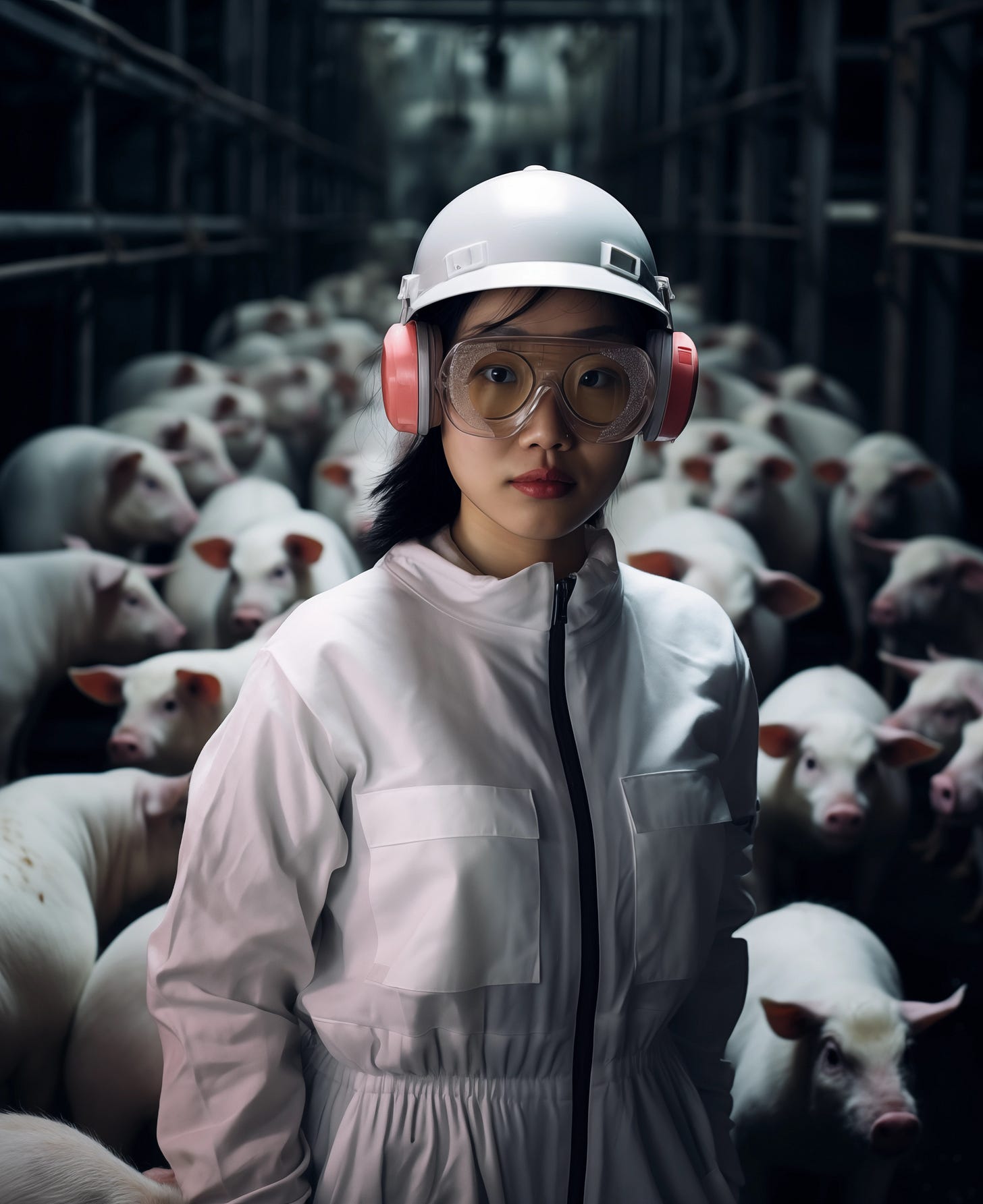 I manage 5,000 pigs on floor 55. The 32 floors above me house the fermented pork protein production floors where Jie works. Despite the size of my floor, I am the only technician on 55, just like all the other floors. I rarely need to walk on the production floor and spend most of my shift inside a clean control room in the center of the floor. My dimly lit control room space is four by 4 meters large with a small restroom and countertop with a microwave oven and hot water kettle. The control console and screens run along the edge of the room with large shatterproof windows where I can look out onto the floor without getting up from my chair.
