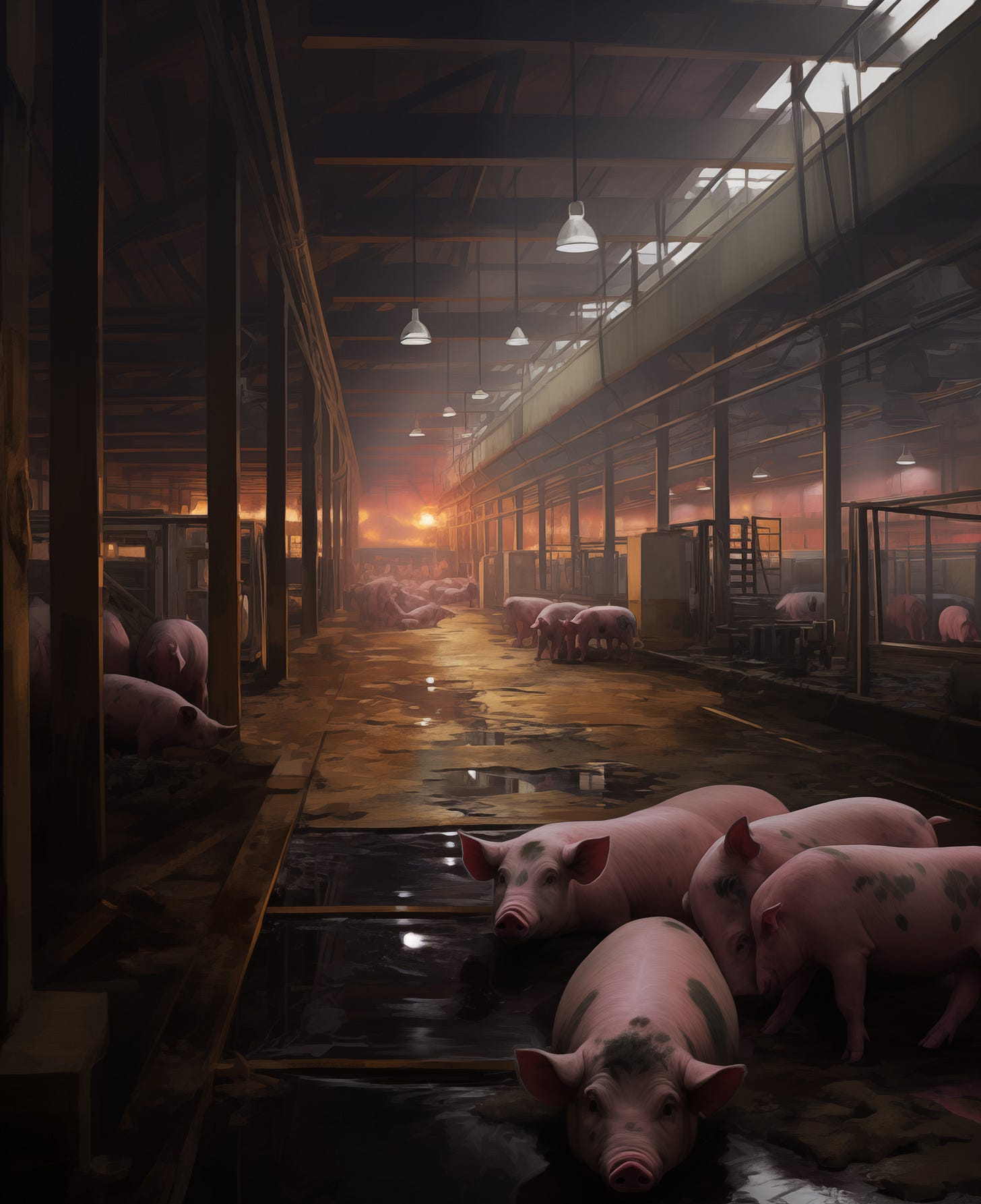 Our skyscraper farm has a dedicated mega-scale fusion reactor on the ground floor, providing a virtually endless supply of cheap, clean power. The reactor heats water for a series of steam engines that provide electricity and hot water for heating, drinking, and bathing for the pigs. There are no windows to the outside on the pig floors, so high-definition OLED panels mounted on the wall and ceiling display outdoor landscape scenery and artificial sky and sunlight above. Air ventilation grates line the ceiling to bring in cold air during summer and pull out harmful gas concentrations. We have been taught since new technician training that our controlled indoor environments provide pigs with optimal living conditions, free from the variables and discomfort that come from living on legacy outdoor farms. I fully control the floor’s artificial climate system and can simulate seasons and weather events, such as rainstorms, to bathe the pigs. The floors are angled at a precise pitch so that artificial rainwater will flow toward drainage gates, bringing highly valued pig feces with it.