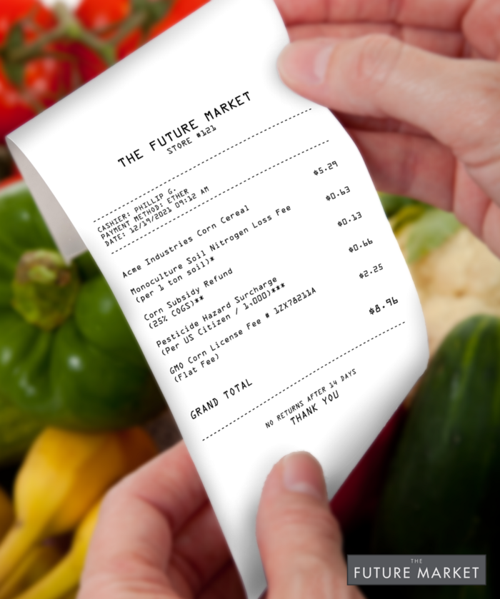 The prices are low because this way of farming yields a lot. But at what broader cost to the ecosystem and society does this maniacal focus on yield create? What’s the aggregate cost of global warming caused by fossil fuel based transport and production methods? What’s the aggregate cost of water purification needed to remediate the effects of pesticide ridden runoff? What’s the aggregate cost on healthcare from making junk food insanely cheaper than real food?