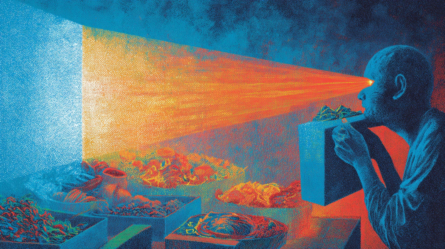 Every time someone develops their own palate and stops needing the feed to tell them what to want, that’s one fewer data point. One fewer view. One fewer like. This isn’t about solving the problem—it’s about declining to participate in it. The people most susceptible to food marketing are those who haven’t thought much about food beyond what tastes good and what’s easy. That’s not a flaw; it’s the default in a busy life. But that default is exactly what the system relies on. Developing food literacy disrupts it—the quiet act of starving the feed.